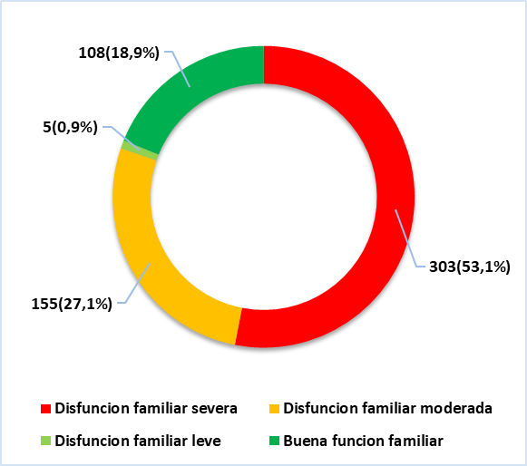 Podemos observar en la figura 1 que, el 53,1 %(n=303) de los participantes tienen una disfunción familiar severa, 27,1 %(n=155) disfunción familiar moderada, 0,9 %(n=5) disfunción familiar leve y 18,9 %(n=108) buena función familiar.