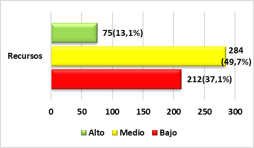 En la figura 6, podemos observar que, 13,1 %(n=75) de los participantes tienen un nivel alto de funcionalidad familiar con respecto a su dimensión recursos, 49,7 %(n=284) funcionalidad familiar media y 37,1 %(n=212) funcionalidad familiar baja.