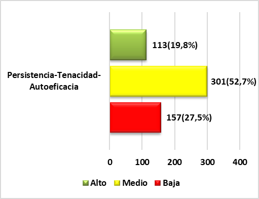 En la figura 2, podemos observar, que el 19,8 % (n=113) tienen una resiliencia alta con respecto a su dimensión persistencia-tenacidad-autoeficacia, 52,7 % (n=301) resiliencia media y 27,5 % (n=157) resiliencia baja.