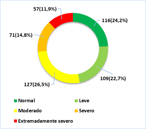 We can see in figure 2 that 39,8 % (n=191) of participants have a normal level of depression, 13,5 % (n=65) have mild depression, 27,1 % (n=130) have moderate depression, 4,8 % (n=23) have severe depression, and 14,8 % (n=71) have extremely severe depression.