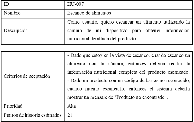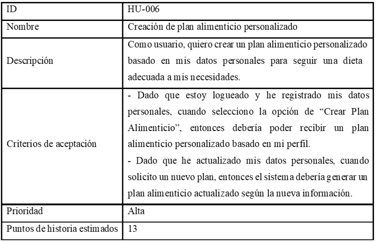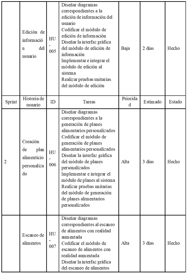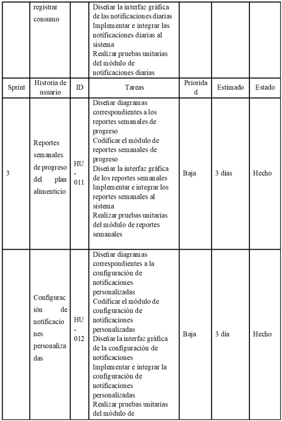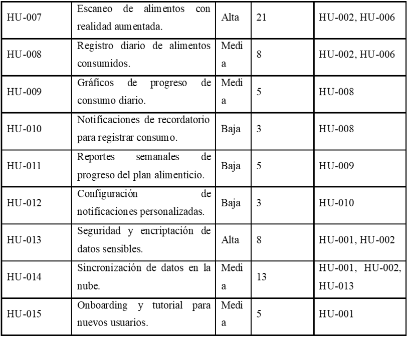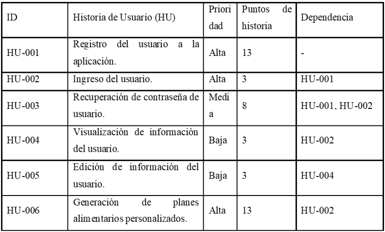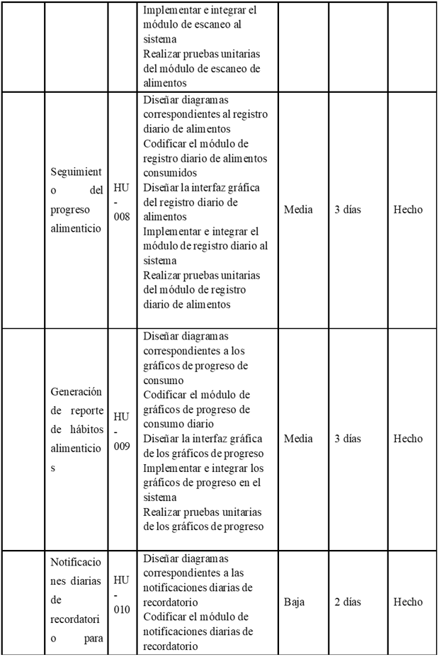 The following is the description of the system developed for the planning and monitoring of eating habits through a mobile application. The Product Backlog is presented, which contains the user stories necessary for the development of the system, each one of them with its priority and effort estimation (Story Points).