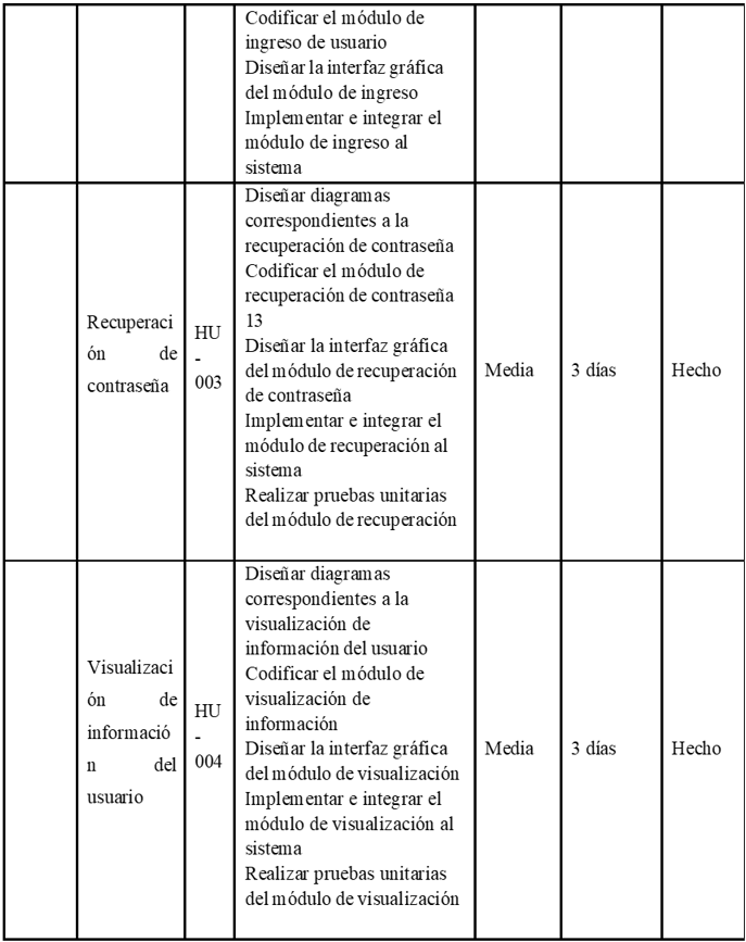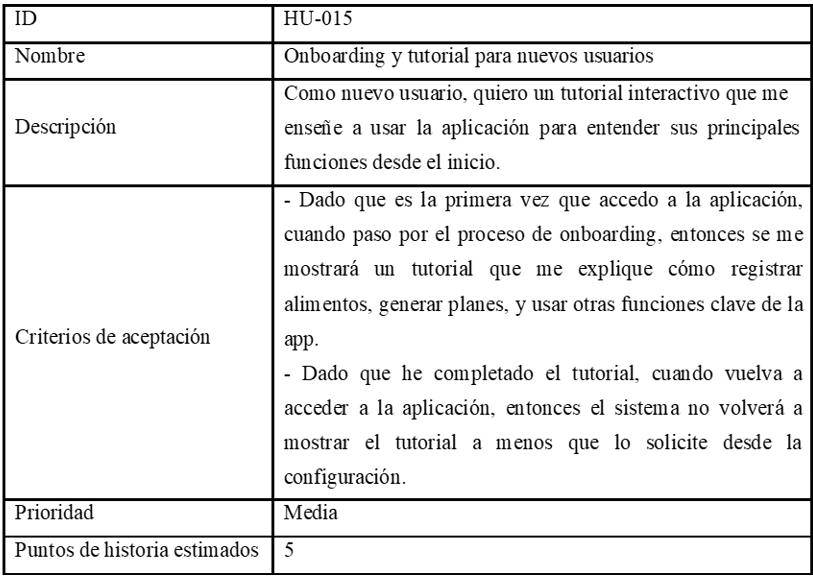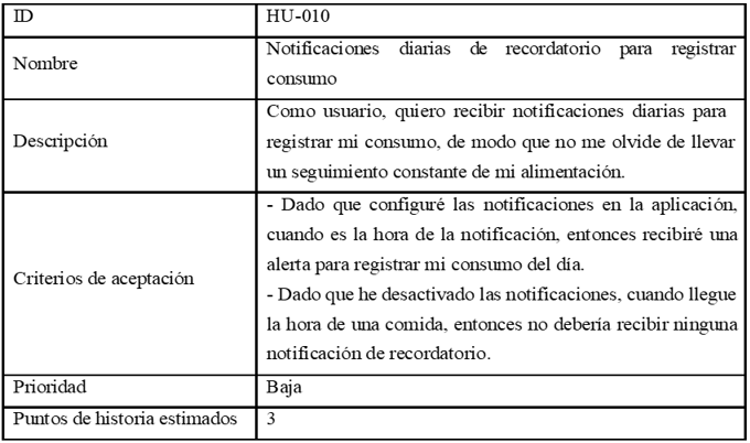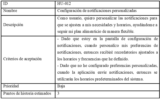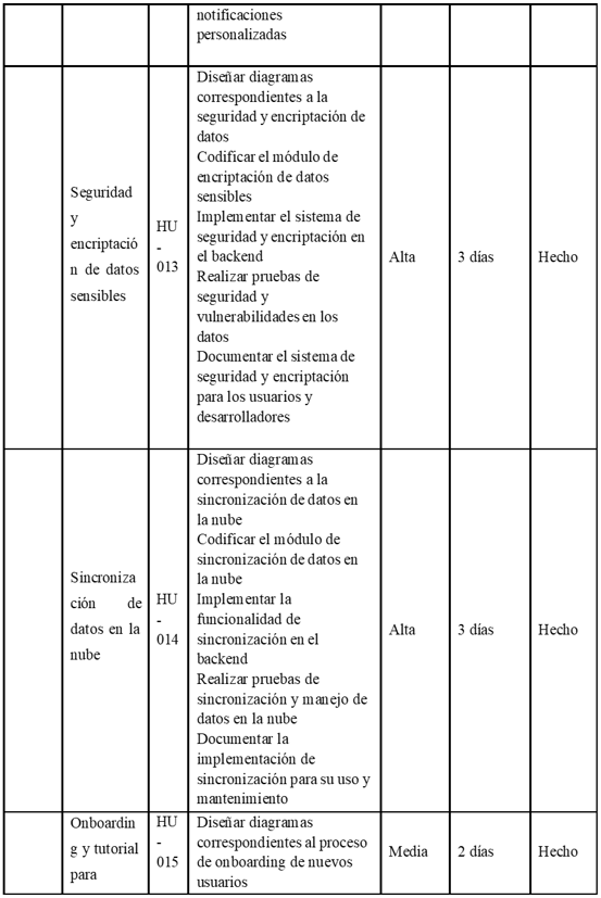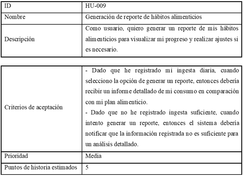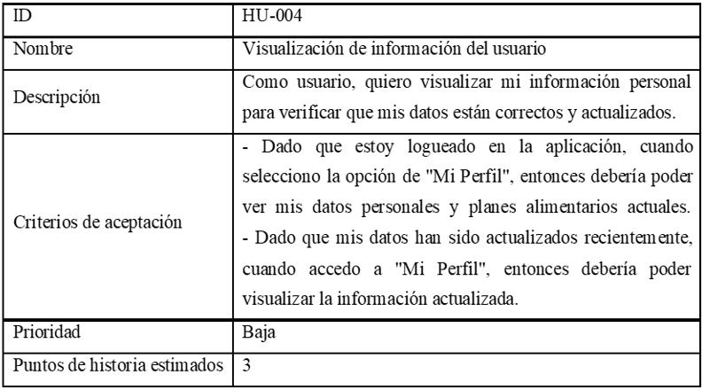 The following is the description of the system developed for the planning and monitoring of eating habits through a mobile application. The Product Backlog is presented, which contains the user stories necessary for the development of the system, each one of them with its priority and effort estimation (Story Points).