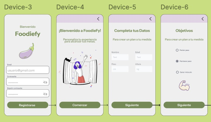 From the moment the user enters their personal data and sets their dietary goals, until a personalized meal plan is generated and progress is tracked through the recording of food consumed and product scanning.