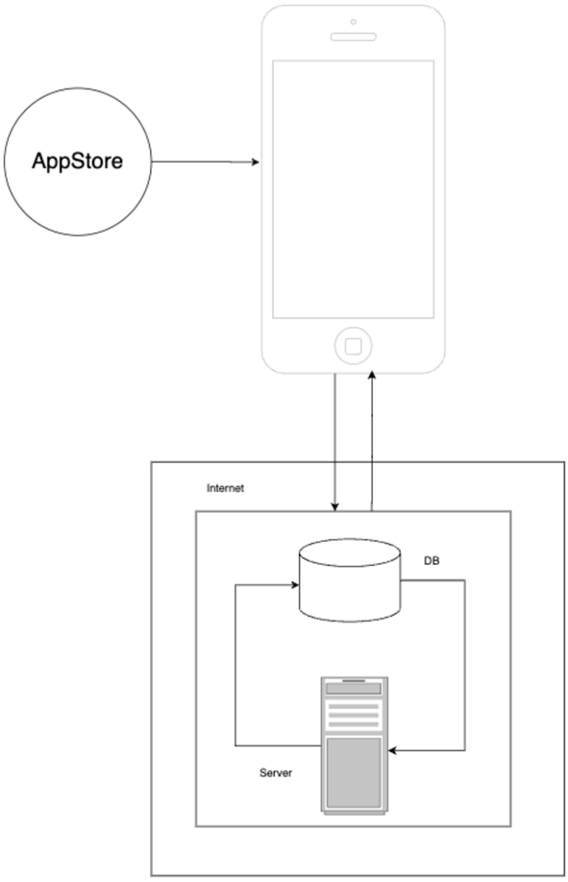 Communication between the mobile device, the server and the database takes place over the Internet, ensuring that data remains synchronized and accessible to users from any location. Once the server processes the information or performs an update, it sends the response back to the mobile device, allowing the user to view the results in real time.