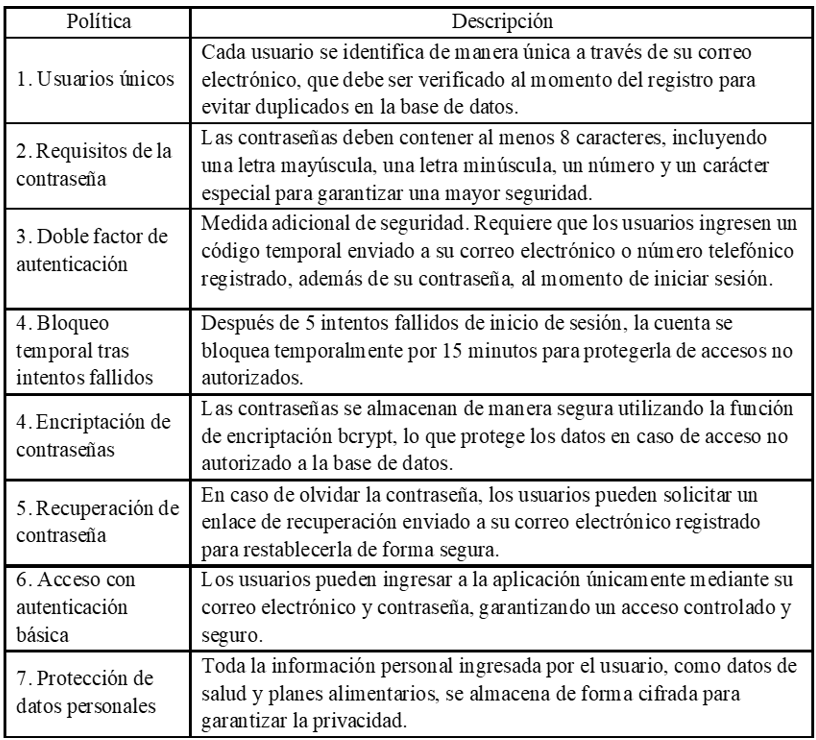 The following table details the security policies implemented for access to the mobile food planning application. These policies aim to protect users' personal information and ensure secure access to the application.