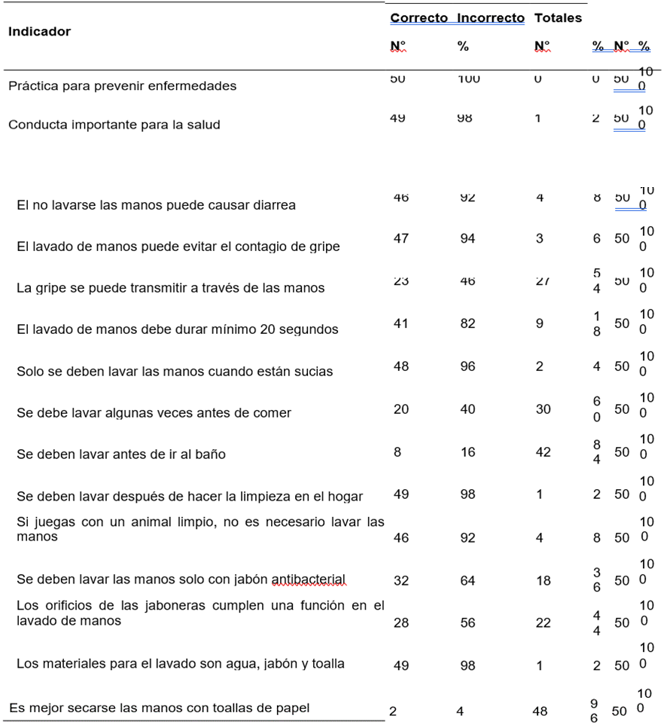 En la figura 5, orientada a los conocimientos generales sobre el lavado de manos, se evidencia que el 100 % de los encuestados reconoció que esta práctica previene enfermedades. En cuanto a considerarla una conducta importante para la salud, el 98 % respondió correctamente y el 2 % de forma incorrecta. Respecto a la relación entre no lavarse las manos y enfermedades como la diarrea, el 92 % respondió correctamente, mientras que el 8 % lo hizo de manera incorrecta. Sobre la capacidad del lavado de manos para evitar el contagio de la gripe, el 94 % respondió de forma correcta y el 6 % incorrectamente, aunque solo el 46 % identificó que la gripe se transmite a través de las manos, frente al 54 % que respondió de manera incorrecta. En relación al tiempo adecuado de lavado de manos, el 82 % respondió correctamente, mientras que el 18 % respondió de manera incorrecta. Respecto a lavarse las manos únicamente cuando están sucias, el 96 % respondió de manera correcta y el 4 % de forma incorrecta. En cuanto al lavado de manos antes de comer, el 40 % respondió correctamente y el 60 % de forma incorrecta, mientras que solo el 16 % indicó que es necesario lavarse las manos antes de ir al baño, frente al 84 % que respondió de manera incorrecta. Sobre el lavado de manos después de realizar la limpieza del hogar, el 98 % respondió correctamente y el 2 % de manera incorrecta. Con respecto al lavado de manos tras jugar con un animal limpio, el 92 % respondió correctamente y el 8 % de forma incorrecta. En relación al uso exclusivo de jabón antibacterial, el 64 % respondió correctamente y el 36 % de forma incorrecta. Sobre los orificios en la jabonera y su función en el lavado de manos, el 56 % respondió correctamente y el 44 % incorrectamente. En cuanto a los materiales usados para el lavado de manos, el 98 % respondió correctamente y el 2 % de manera incorrecta. Finalmente, solo el 4 % consideró que las toallas de papel son mejores para el secado de manos, mientras que el 96 % respondió de forma incorrecta. Estos resultados reflejan áreas de conocimiento sólido, pero también aspectos que requieren mayor refuerzo educativo.