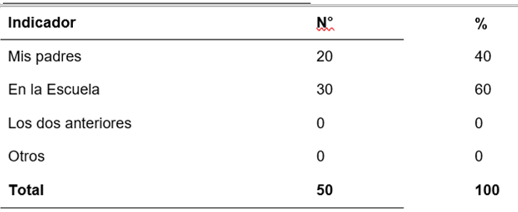 With regard to specifying the source of information on handwashing among sixth- and seventh-grade children at CADE, Santo Domingo, in 2024, the results indicate that the 100 % of sixth and seventh grade students have received information about handwashing, with 40 % attributing this teaching to their parents and 60 % to school, highlighting the importance of school education in promoting hygiene practices. Previous studies have demonstrated the effectiveness of educational interventions on hand hygiene within the school environment. For example, research conducted at the School in Cienfuegos, Cuba, implemented an educational program on hand hygiene in fourth-grade children, observing a significant improvement in students' knowledge and practices after the intervention.