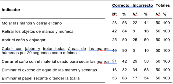 Figure 9 describes the sample's knowledge of the correct handwashing procedure, reflecting the order of each step according to the participants' level of knowledge. Ninety-eight percent correctly indicate that wetting your hands and turning off the tap is step 2, while 2 % place it incorrectly. One hundred percent correctly indicated that removing objects from the hands and wrists is step 1. Ninety-eight percent correctly indicated that turning on the tap and rinsing is step 4, but 2 % placed it incorrectly. 100 % correctly state that covering with soap and rubbing all areas of wet hands for at least 20 seconds is step number 3. 98 % correctly indicate that turning off the tap with the material used to dry hands is step number 6, while 2 % place it incorrectly. 98 % correctly state that removing excess water from the hands and drying them is step number 5, and 2 % place it incorrectly. 100 % correctly indicate that step 7 is to dispose of the disposable paper or hang up the towel.