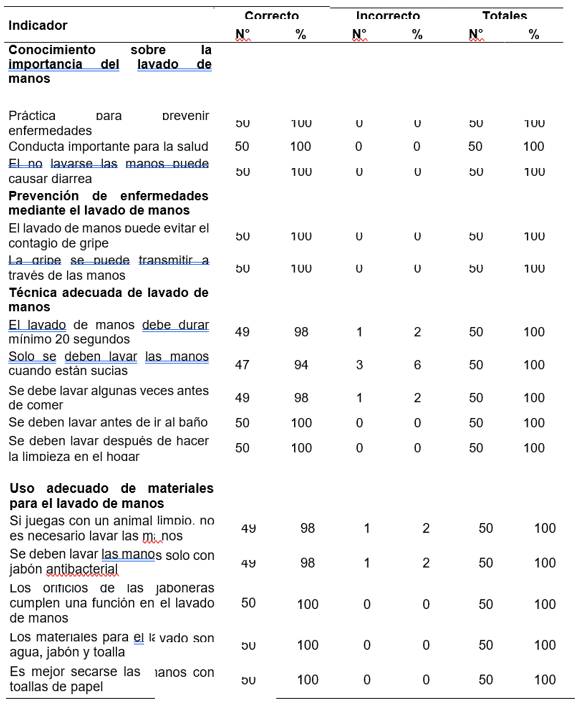On the other hand, descriptive statistical techniques, such as frequency and percentage, were applied to analyze the data, allowing the information to be summarized clearly and accurately to determine whether there were significant differences between the groups of children in terms of knowledge and practice of handwashing. To this end, Microsoft Excel software was used Microsoft Excel software was used, which facilitated the organization and visualization of the information collected.