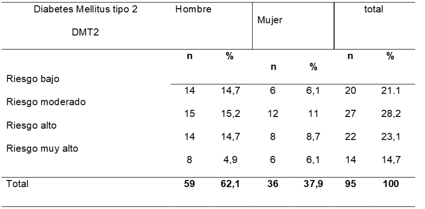 La evaluación del nivel de riesgo mediante el cuestionario FINDRISC determinó que un 35 % de la población evaluada se encuentra en un nivel de riesgo alto o muy alto de desarrollar diabetes mellitus tipo 2 en los próximos años. Este hallazgo subraya la urgencia de implementar estrategias de intervención para prevenir la progresión de la enfermedad en este grupo vulnerable.