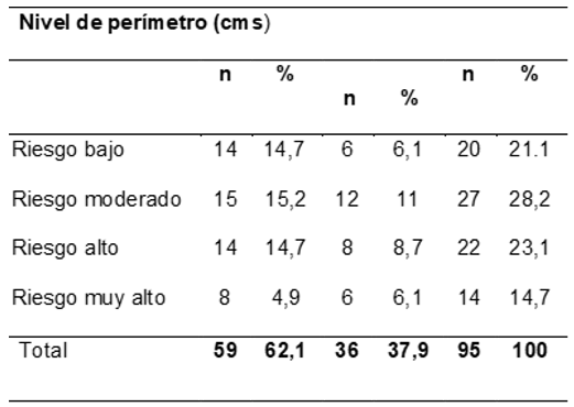 La figura 4 muestra la distribución de los participantes según su nivel de riesgo basado en el perímetro de cintura, un indicador clave para evaluar el riesgo de desarrollar diabetes mellitus tipo 2. Del total de los encuestados, el 28,2 % presenta un riesgo moderado, con una mayor proporción de hombres (15,2 %) frente a mujeres (11 %). El 23,1 % de la población tiene un riesgo alto, distribuyéndose en 14,7 % de hombres y 8,7 % de mujeres. En cuanto al riesgo muy alto, el 14,7 % de los participantes se encuentra en esta categoría, con una diferencia leve entre hombres (4,9 %) y mujeres (6,1 %). Finalmente, el 21,1 % de la población presenta un riesgo bajo, siendo más frecuente entre los hombres (14,7 %) en comparación con las mujeres (6,1 %). Estos resultados indican que una proporción considerable de la población estudiada tiene un riesgo moderado a alto de desarrollar diabetes tipo 2 según el perímetro de cintura, lo que subraya la importancia de monitorear y gestionar este factor de riesgo en la comunidad.(24,25,26)