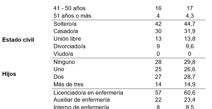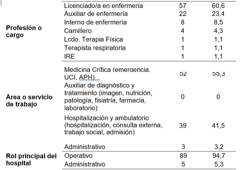 En la figura 4 se describen las características sociales y demográficas del personal de enfermería en el Hospital General IESS de Santo Domingo en 2024. El género con mayor representación fue el femenino, con el 80,9 %, mientras que en el masculino representó el 18,1 %. Los participantes en el rango de edad entre los 31 a 40 años constituyeron el 57,4 %, solteros/as 44,7 %, casados/as 31,9 %, unión libre 13,8 % y divorciados 9,6 %. Además, 29,8 % de los participantes no tienen hijos. En cuanto a los títulos profesionales, el 60,6 % son licenciados/as en enfermería, el 23,4 %, son auxiliares, además en esta participación se encuentran también internos el 8,5 %, camilleros 4,3 % y otros profesionales. La mayoría de los participantes se encuentra en medicina crítica, con el 55,3 %, sobresaliendo el área operativa, con el 94,7 %. En cuanto al tiempo de servicio oscila entre los 7 y 10 años 53,7 %; y el 89,4 %, trabaja en turnos rotativos, mientras que el 10,6 % tiene turnos diurnos.