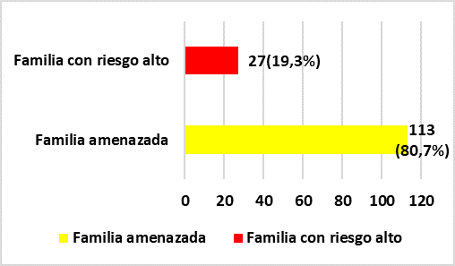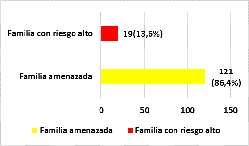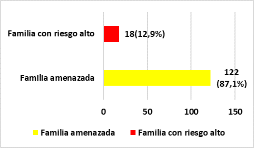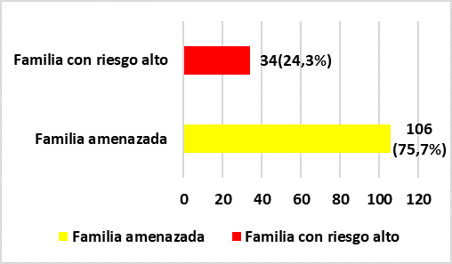 En la figura 1, se puede observar que, el 62,9 % de los participantes tienen una familia con riesgo bajo, el 27,1 % tienen familias amenazadas y 10 % tienen familias con riesgo alto.