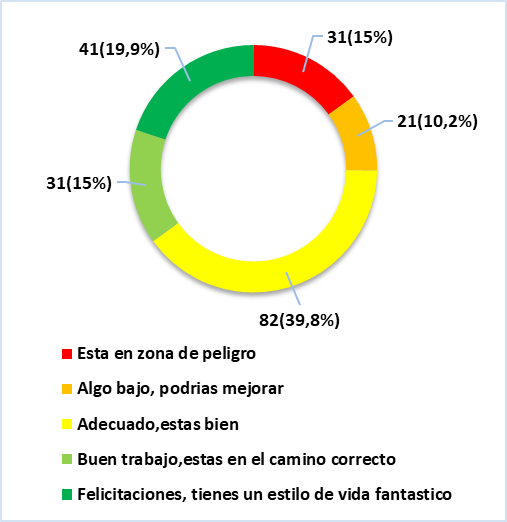 En la figura 2, podemos observar que, 15 %(n=31) de los participantes están en zona de peligro en cuanto a su estilo de vida, 10,2 %(n=21) están algo bajo, podrías mejorar en su estilo de vida, 39,8 %(n=82) están con un estilo de vida adecuado, 15 %(n=31) están haciendo un buen trabajo en cuanto a su estilo de vida y 19,9 %(n=41) tienen un estilo de vida fantástico.