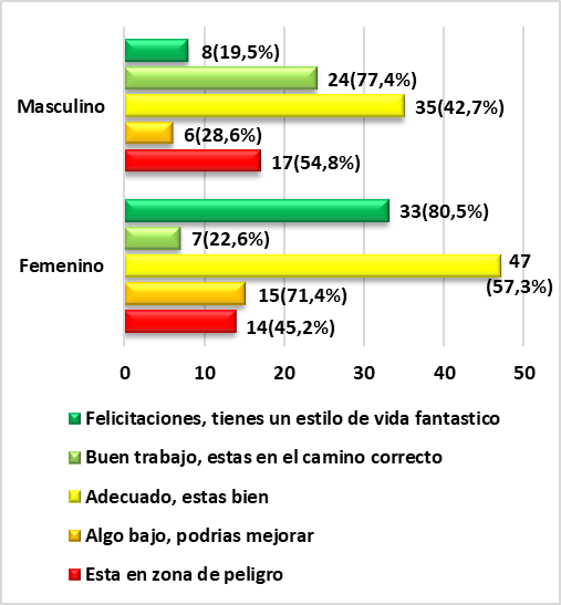 En la figura 3, se puede observar que, en relación al sexo, en el sexo masculino, 54,8 %(n=17) su estilo de vida está en zona de peligro, 28,6 %(n=6) su estilo de vida esta algo bajo pero puede mejorar, 42,7 %(n=35) su estilo de vida esta adecuado, 77,4 %(n=24) está haciendo un buen trabajo en su estilo de vida y 19,5 %(n=8) tienen un estilo de vida fantástico.