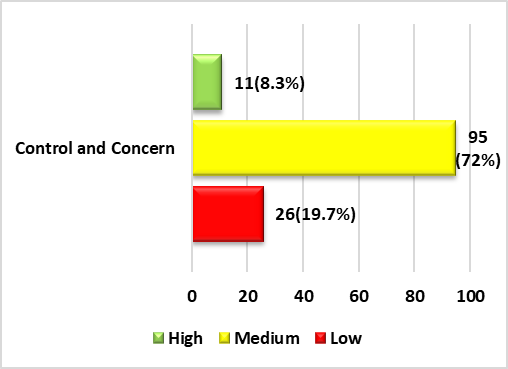 In figure 5, we can see that 8,3 % (n=11) have a high quality of life in terms of control and concern, 72 % (n=95) have an average quality of life, and 19,7 % (n=26) have a low quality of life.