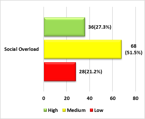 Figure 6 shows that 27,3 % (n=36) of participants have a high quality of life with respect to their social burden dimension, 51,5 % (n=68) have a medium quality of life, and 21,2 % (n=28) have a low quality of life.