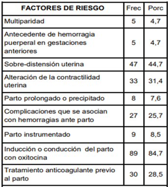 On the other hand, in the study entitled "Factors associated with obstetric hemorrhage in the immediate postpartum period" conducted at the Juan Bruno Zayas Hospital (Cuba), based on a review from January 2015 to December 2018 in a sample of 105 postpartum women, considering the individual medical records of each patient as the primary source of data, the authors, Dr. Margarita Malpartida Ampudia and collaborators, established the following results and conclusions: