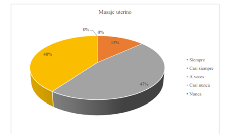 There were a total of 12 nurses, representing 100 % of the sample, with 83 % female and 17 % male. The nursing staff's interventions are reflected in the results, as the personnel in charge of the service are aware of the care they must provide to a postpartum patient. All of the nursing staff confirmed that the procedures to detect possible postpartum hemorrhage must be performed; however, they are not performed 100 % of the time.(8)