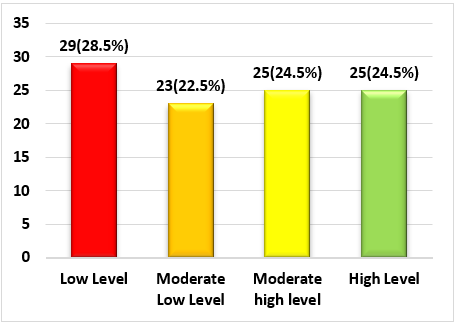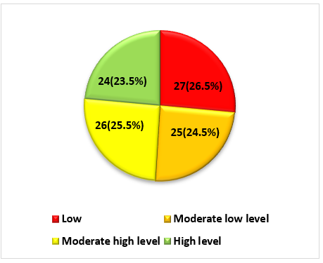 En la figura 1, podemos observar que, el 26,5 % de los profesionales de enfermería tienen un nivel de empatía bajo, 24,5 % nivel de empatía moderado bajo, 25,5 % nivel de empatía moderado alto y el 23,5 % nivel de empatía alto.
