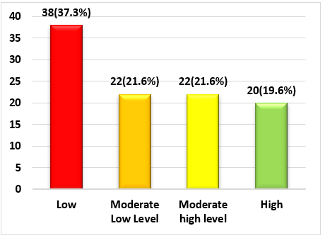 In figure 1, we can see that 26,5 % of nursing professionals have a low level of empathy, 24,5 % have a moderate-low level of empathy, 25,5 % have a moderate-high level of empathy, and 23,5 % have a high level of empathy.