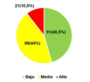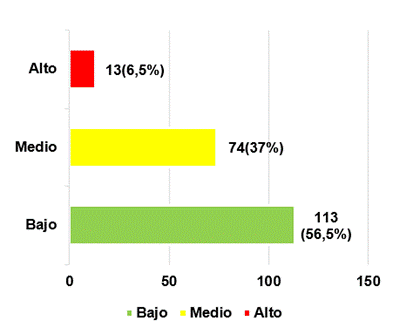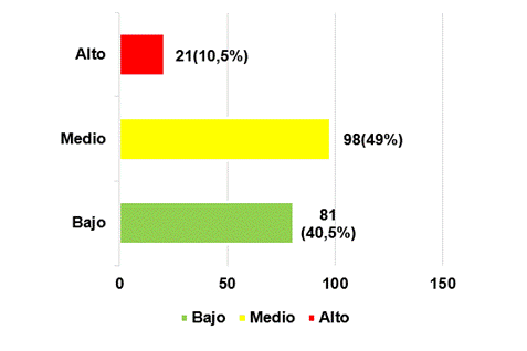 En la figura 1, podemos observar que, el 45,5 % de los participantes tienen un nivel de estrés bajo, 44 % estrés medio y 10,5 % estrés alto.