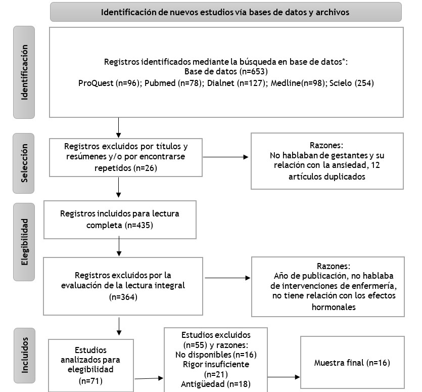 Método: revisión narrativa de la literatura realizada en enero de 2023; búsqueda en PubMed, ProQuest, Dialnet, SciELO y Medline; criterios: estudios últimos 5 años en español, inglés o portugués que trataran explícitamente la ansiedad en gestantes; selección final: 16 documentos tras cribado de 653 registros.