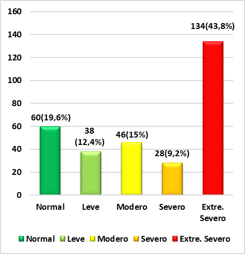 En la figura 3, podemos observar con respecto a la dimensión ansiedad que, el 19,6 % (n=60) tienen una ansiedad normal, 12,4 % (n=38) una ansiedad leve, 15 % (n=46) una ansiedad moderada, 9,2 % (n=28) una ansiedad severa y 43,8 % (n=134) una ansiedad extremadamente severa.