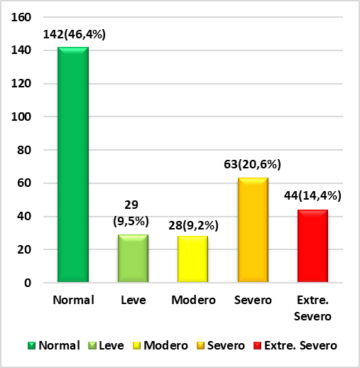En la figura 4, podemos observar que, el 46,4 % (n=142) de los participantes tienen un estrés normal 9,5 % (n=29) estrés leve, 9,2 % (n=28) estrés moderado, 20,6 %(n=63) estrés severo y 14,4 % (n=44) estrés extremadamente severo.