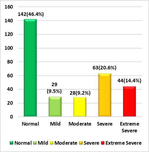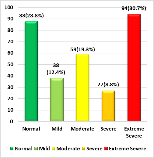 In figure 2, we can see that, with regard to depression, 28,8 % (n=88) of participants have normal depression, 12,4 % (n=38) have mild depression, 19,3 % (n=59) have moderate depression, 8,8 % (n=27) have severe depression, and 30,7 % (n=94) have extremely severe depression.