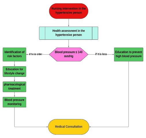 Figura 1. Diagrama de flujo sobre la intervención que realiza el profesional de enfermería para los cuidados de los pacientes hipertensos
