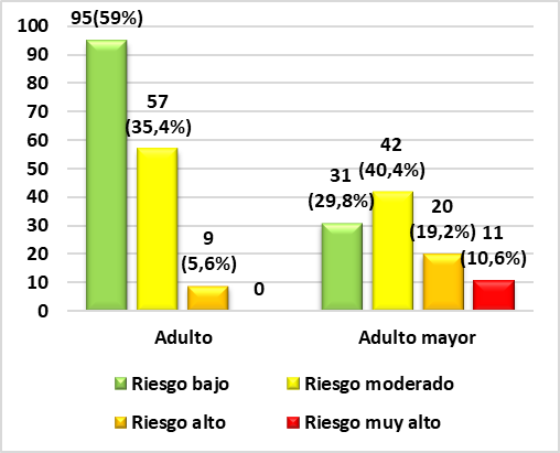 En la figura 4, podemos observar que, el 59 %(n=95) de los participantes adultos tienen un riesgo cardiovascular bajo, 35,4 %(n=57) un riesgo cardiovascular moderado, 5,6 %(n=9) un riesgo cardiovascular alto y ninguno de los adultos presento riego cardiovascular muy alto; en cuanto a los adultos mayores, el 29,8 %(n=31) tienen un riesgo cardiovascular bajo, 40,4 %(n=42) tienen un riesgo cardiovascular moderado, 19,2 %(n=20) tienen un riesgo cardiovascular alto y 10,6 %(n=11) tienen un riesgo cardiovascular muy alto.